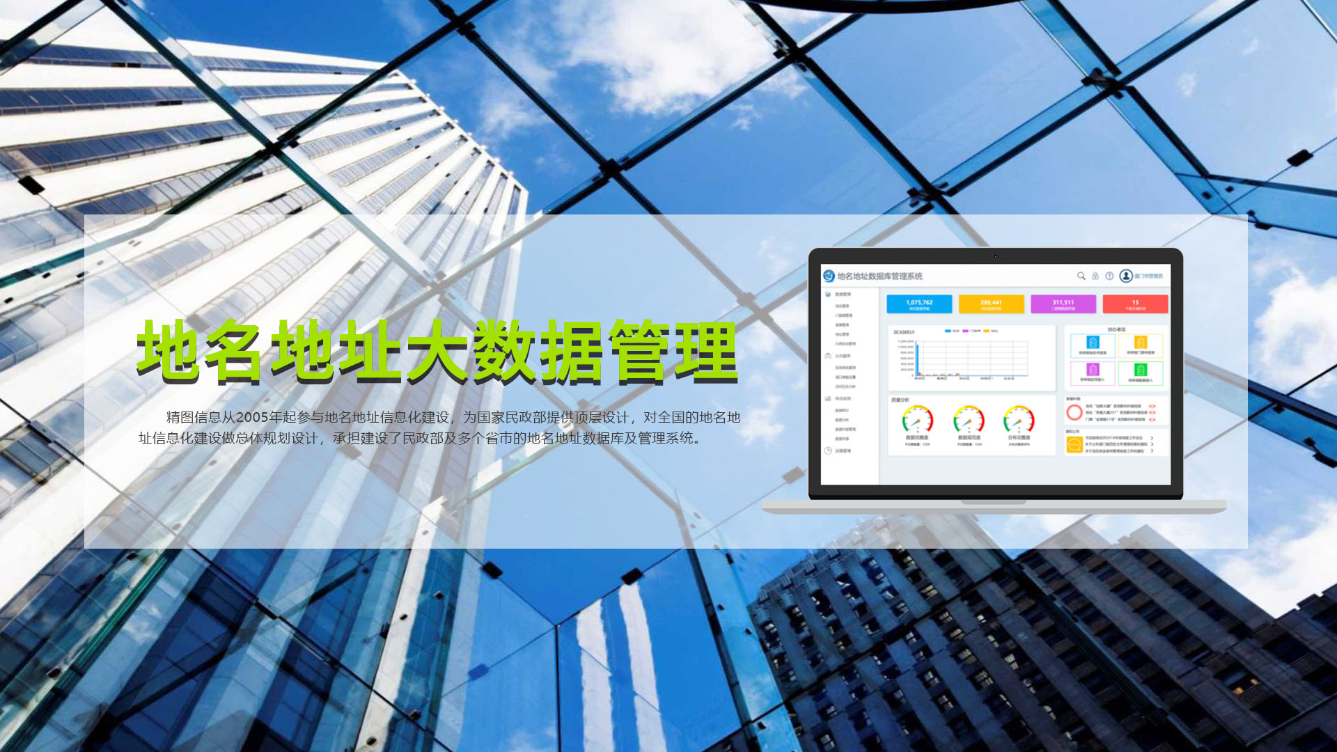 創(chuàng)立于1999年,是北京飛利信科技股份有限公司(股票代碼:300287)子公司,是國家創(chuàng)新型企業(yè)、國家火炬計劃重點高新技術(shù)企業(yè);獲批建有福建省博士后創(chuàng)新實踐基地、福建省院士專家工作站、廈門市院士專家工作站。精圖信息承擔了國家發(fā)改委、國家工信部、國家科技部、國家住建部、國家民政部等重大和重要專項50多項,主導和參與制定國家和行業(yè)標準、規(guī)程、導則60多項,擁有自主知識產(chǎn)權(quán)的專利和軟件著作權(quán)500多項。